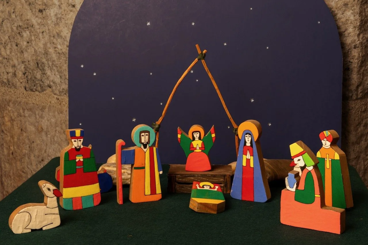 The style of this Nativity—bold colors, simple designs, and glossy surfaces—was popularized by Fernando Llort. Llort has been called “El Salvador’s national artist.” He studied art in France and theology in Belgium, and his work shows influences from Salvadoran folk traditions and Mayan culture. In the 1970s, he moved to the mountain village of La Palma, El Salvador, where he founded a workshop called La Semilla de Dios (The Seed of God). Today La Semilla de Dios continues to operate as a cooperative where local artisans create wood items in the distinctive Llort style.