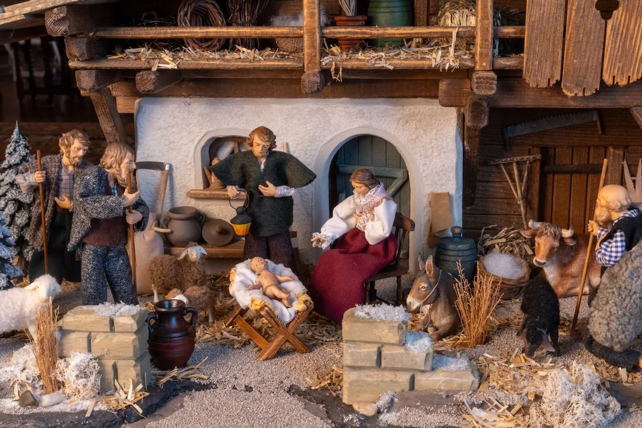 Drawing inspiration from the Tyrolean Dolomite Mountains of northeastern Italy, this Nativity depicts the Holy Family in a Tabia—a traditional 17th-century Alpine barn used for livestock and hay. The barn structure, originally made in the 1980s by the ANRI workshop, was adapted by Navidad Nativities and given a tiered rock base. The evergreens were made by PEMA, and the figures are from the Hannah Collection of Original Heide in Val Gardena, Italy.