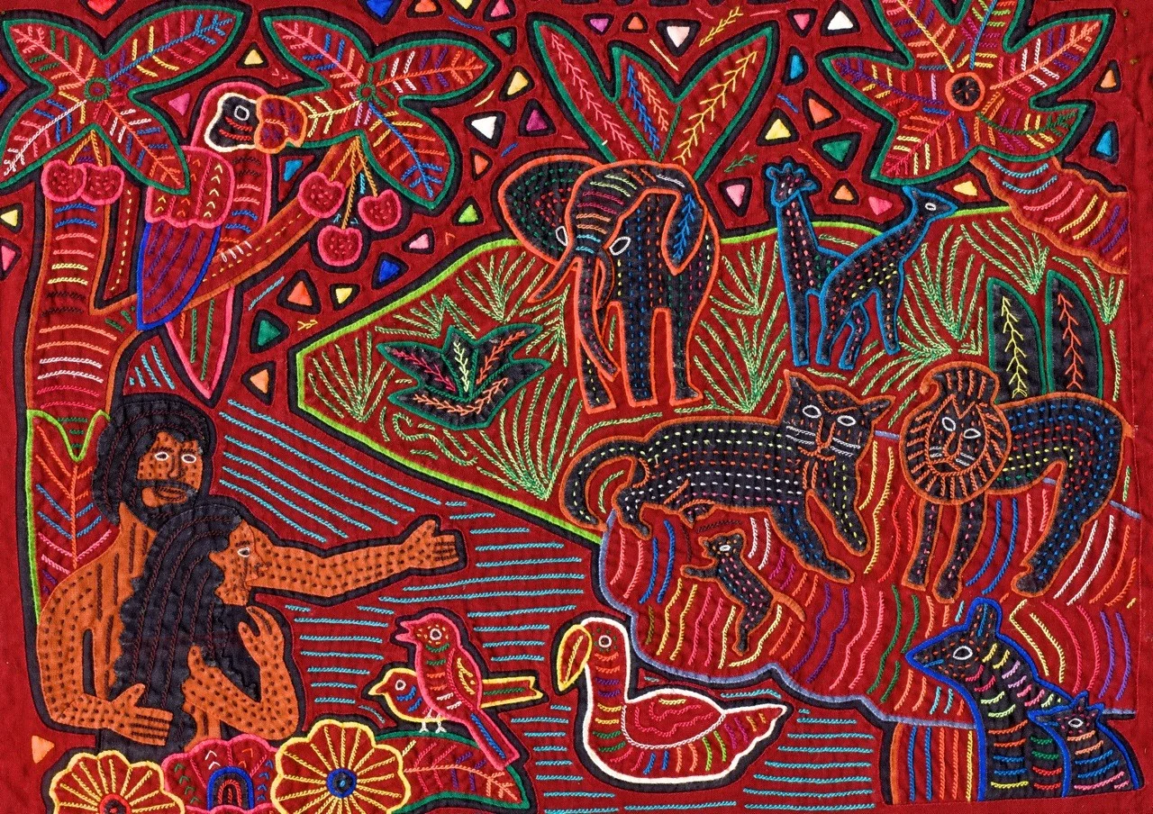 Pictured above: mola panel with Adam, Eve and the animals of Creation.