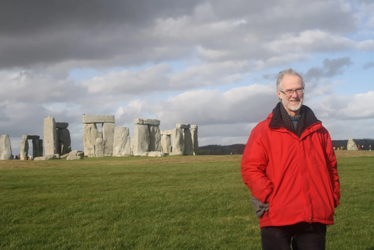 Crispin Paine at Stonehenge, a prehistoric monument in Wiltshire, England.