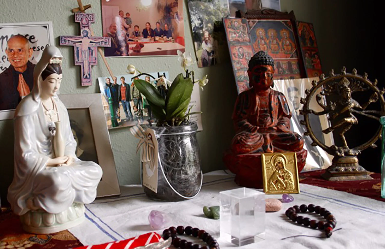 A modern home altar in the “New Age” tradition. In addition to a number of family photos, the altar includes objects from Buddhist, Catholic, Hindu, Orthodox, Ethiopian Orthodox, Tibetan and Chinese traditions. Photo: Crispin Paine.
