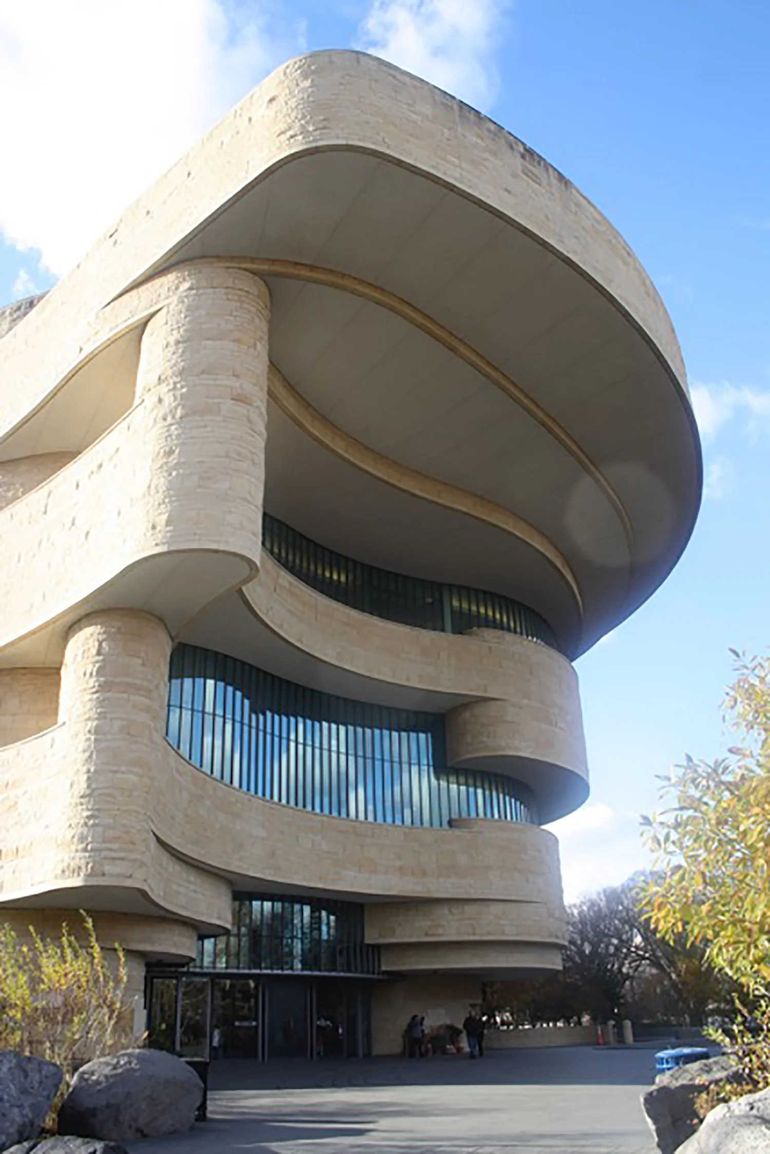 During the design phase of the building in the 1990s, the National Museum of the American Indian consulted with Native communities and individuals across the Western Hemisphere. According to the museum’s website, it was decided that “the building's design should make specific celestial references, such as an east-facing main entrance and a dome that opens to the sky. . . The building’s distinctive curvilinear form, evoking a wind-sculpted rock formation, grew out of this early work, forming the basis for the architecture.” Photo: Crispin Paine.