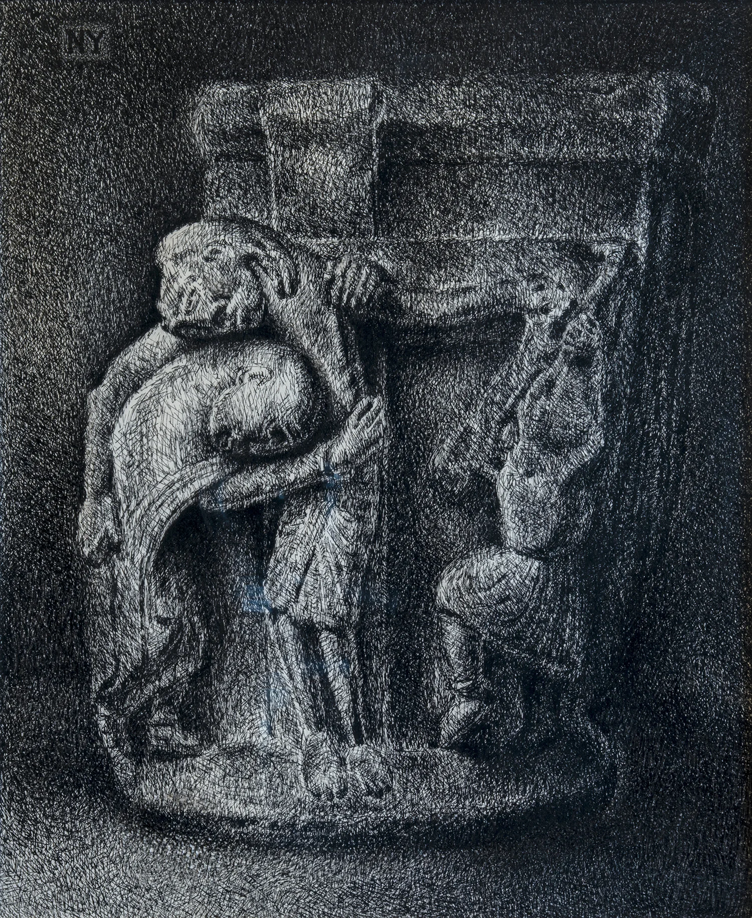 Figure 9: Descent from the Cross. John 19:38-42. Pen and ink, 1977. Collection of Glencairn Museum, donated by Vera P. Glenn. Based on 12th c. (?) limestone capital from Spain in the collection of Glencairn Museum. See Figure 8.