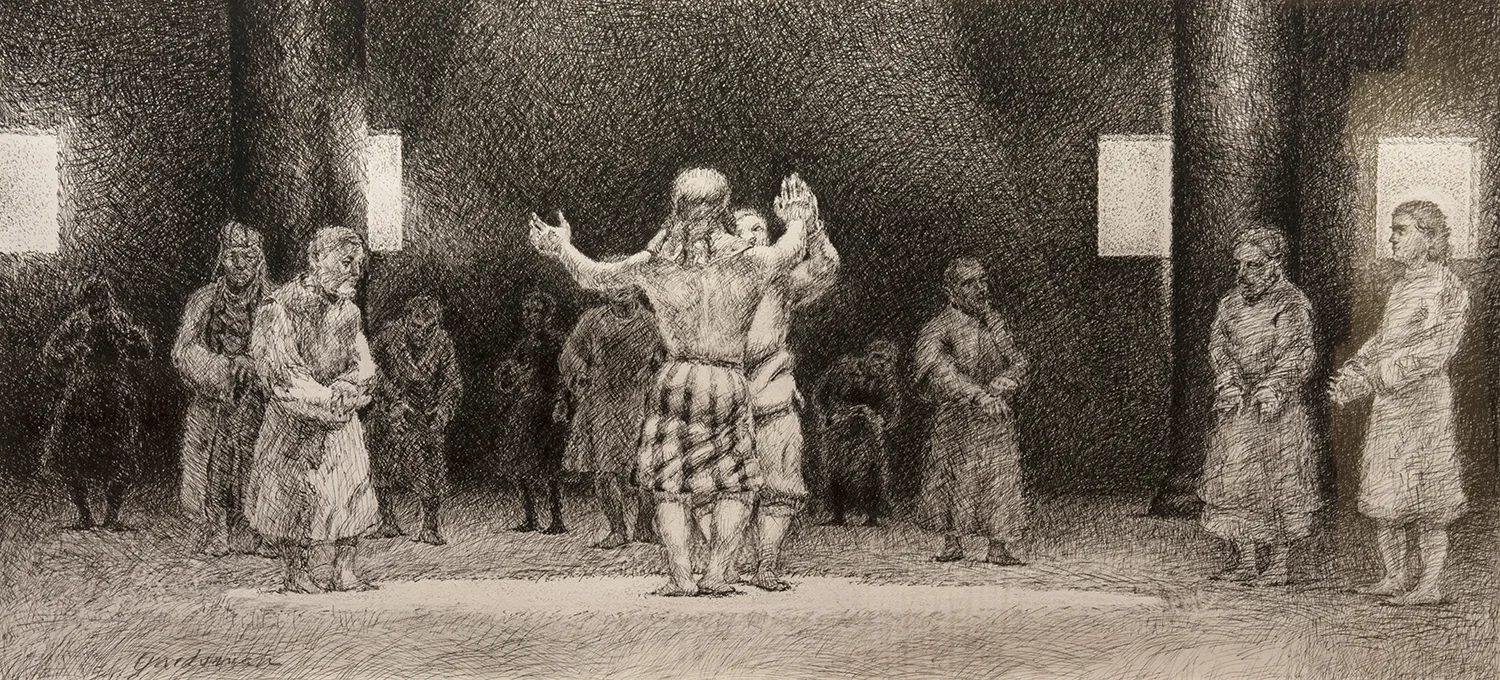 Figure 14: Joseph Revealing His True Identity to His Brothers. Genesis 45:1-15. Pen and ink, 1985. Collection of Glencairn Museum. See Figure 13.
