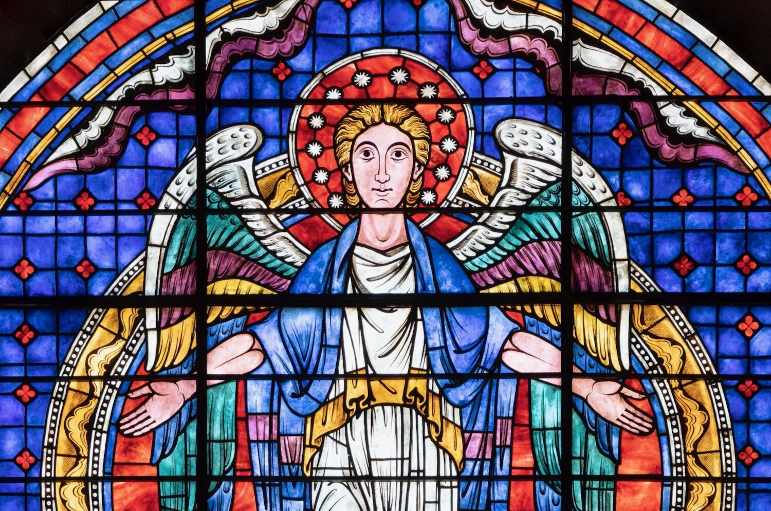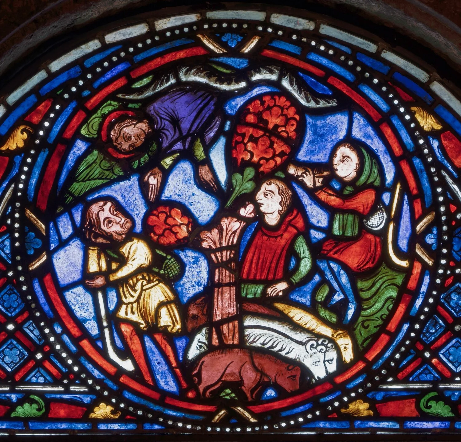 Figure 5: This 13th-century stained-glass roundel illustrates the Annunciation to the Shepherds (Luke 2:8-14), from the narrative of the Nativity of Jesus Christ. Here an angel with green wings and a purple cloak descends from a heavenly cloud and tells the shepherds that they will “find a babe wrapped in swaddling cloths and lying in a manger." (13th century. France. 03.SG.240)
