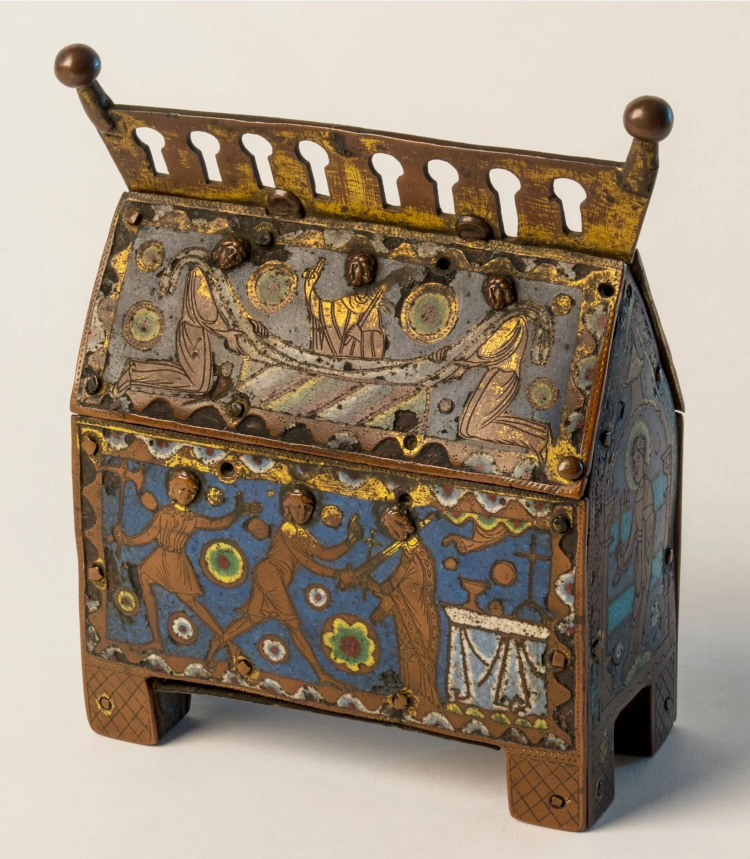 Figure 2: This reliquary box portrays the martyrdom of St. Thomas Becket, who was murdered by the knights of the English King Henry II. As one of the soldiers severs the saint’s head, the hand of God appears from the clouds of heaven to signal that Becket’s martyrdom is divinely ordained (see also Figure 3). (Limoges, France. Circa 1220–30. 05.EN.112)