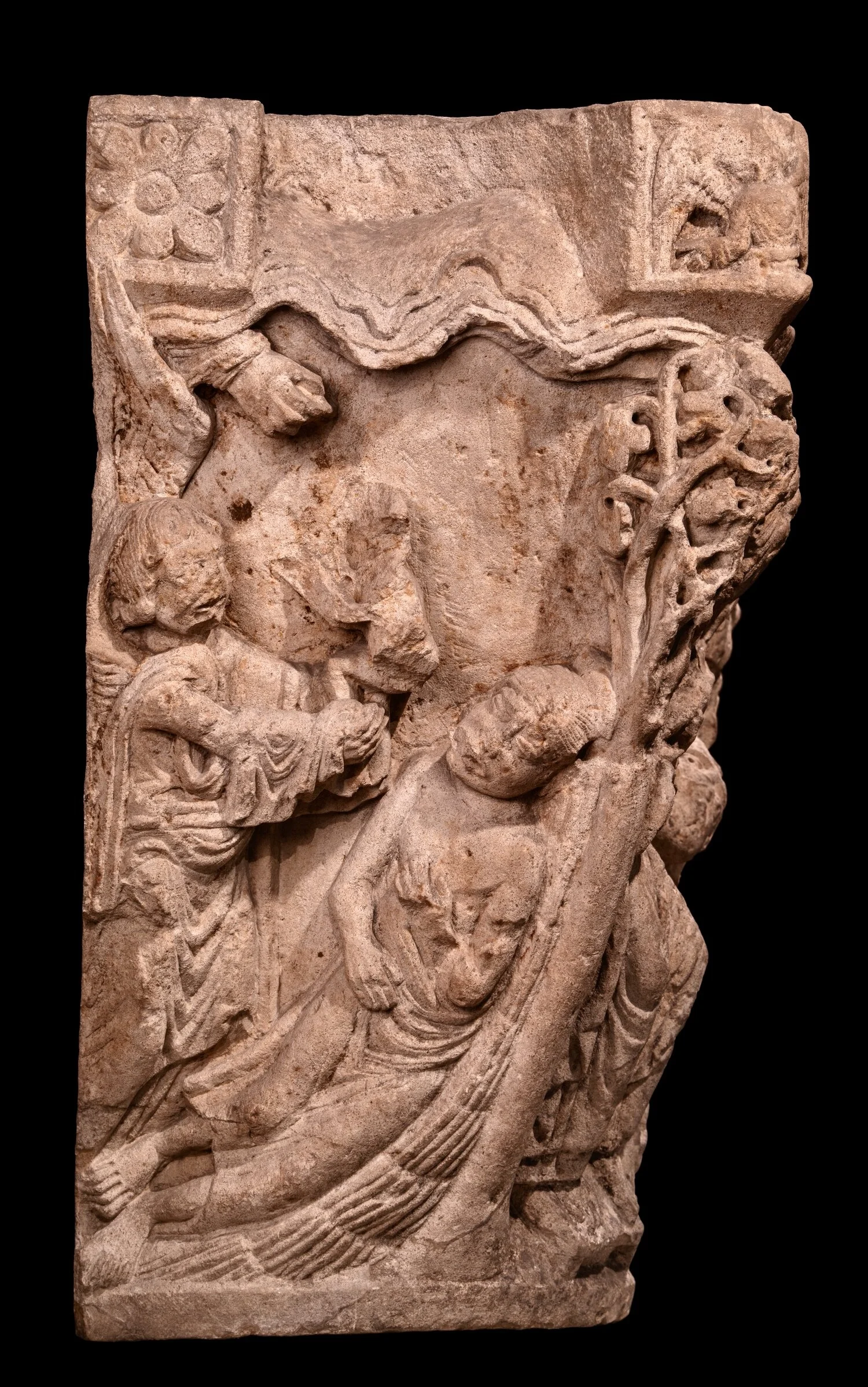 Figure 4: A 12th-century capital in Glencairn’s collection illustrates the biblical story of Lazarus and the rich man (Luke 16:19-31). This side of the capital depicts the death of Lazarus; the hand of God emerges from the clouds of heaven to bless the dying beggar. Read more about this capital here. (Monastery of Moutiers-Saint-Jean in eastern France. 12th century. 09.SP.94)