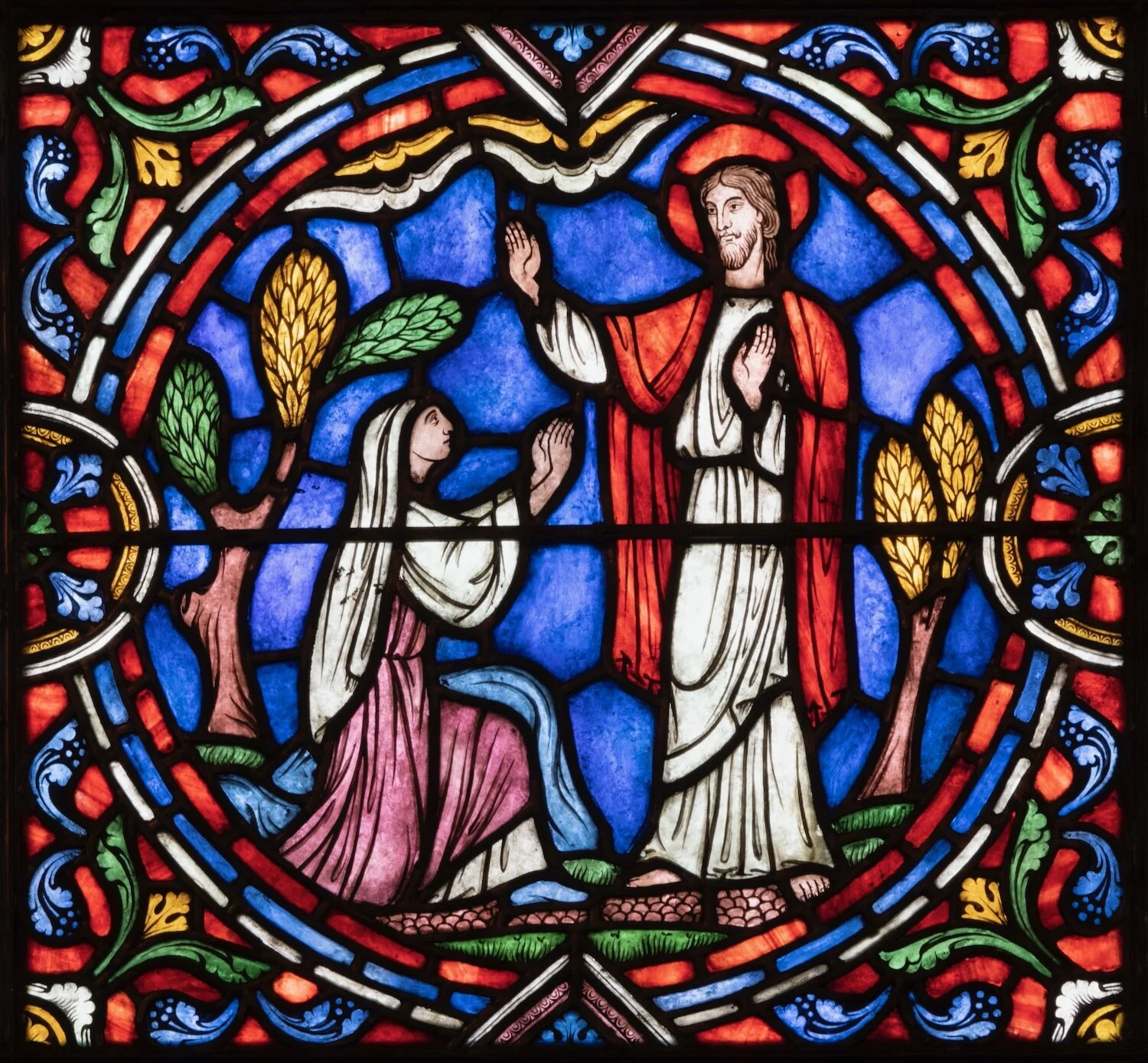 Figure 6: Glencairn’s fifth-floor chapel includes a stained-glass window with three scenes from the Easter story, all created in the Bryn Athyn glassworks. The central panel shows the resurrected Christ meeting with Mary Magdalene (John 20:13-16). The clouds of heaven may be seen just above the raised hand of Jesus.