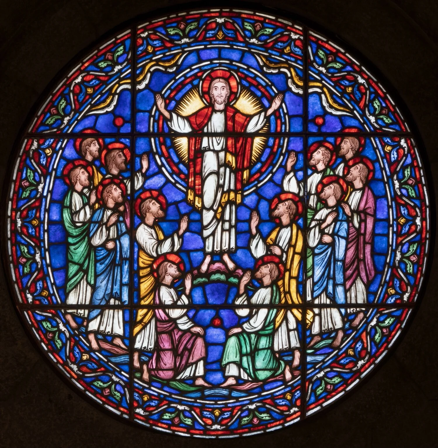 Figure 7: This window, made for the east wall of Glencairn’s chapel, shows Jesus Christ surrounded by the disciples. The clouds of heaven are above them, in wavy bands of yellow and white.