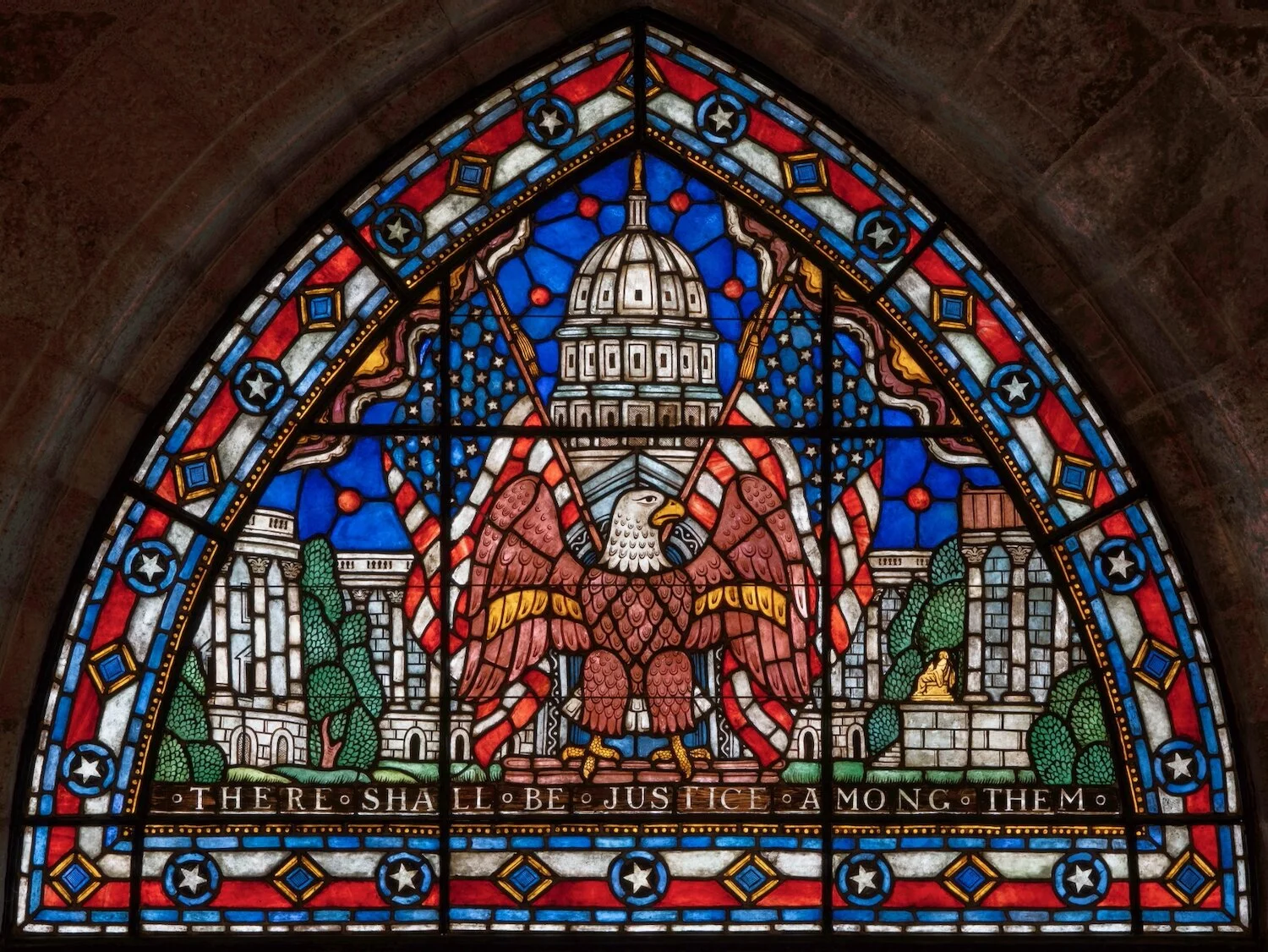 Figure 8: This window in Glencairn’s Upper Hall illustrates the balance of power between branches of the federal government in the United States. Beneath the clouds of heaven motif is the Capitol building (center), the White House (left), and the Supreme Court building (right). Along the bottom is a quotation from one of the works of Emanuel Swedenborg: “There shall be justice among them” (Charity 130).