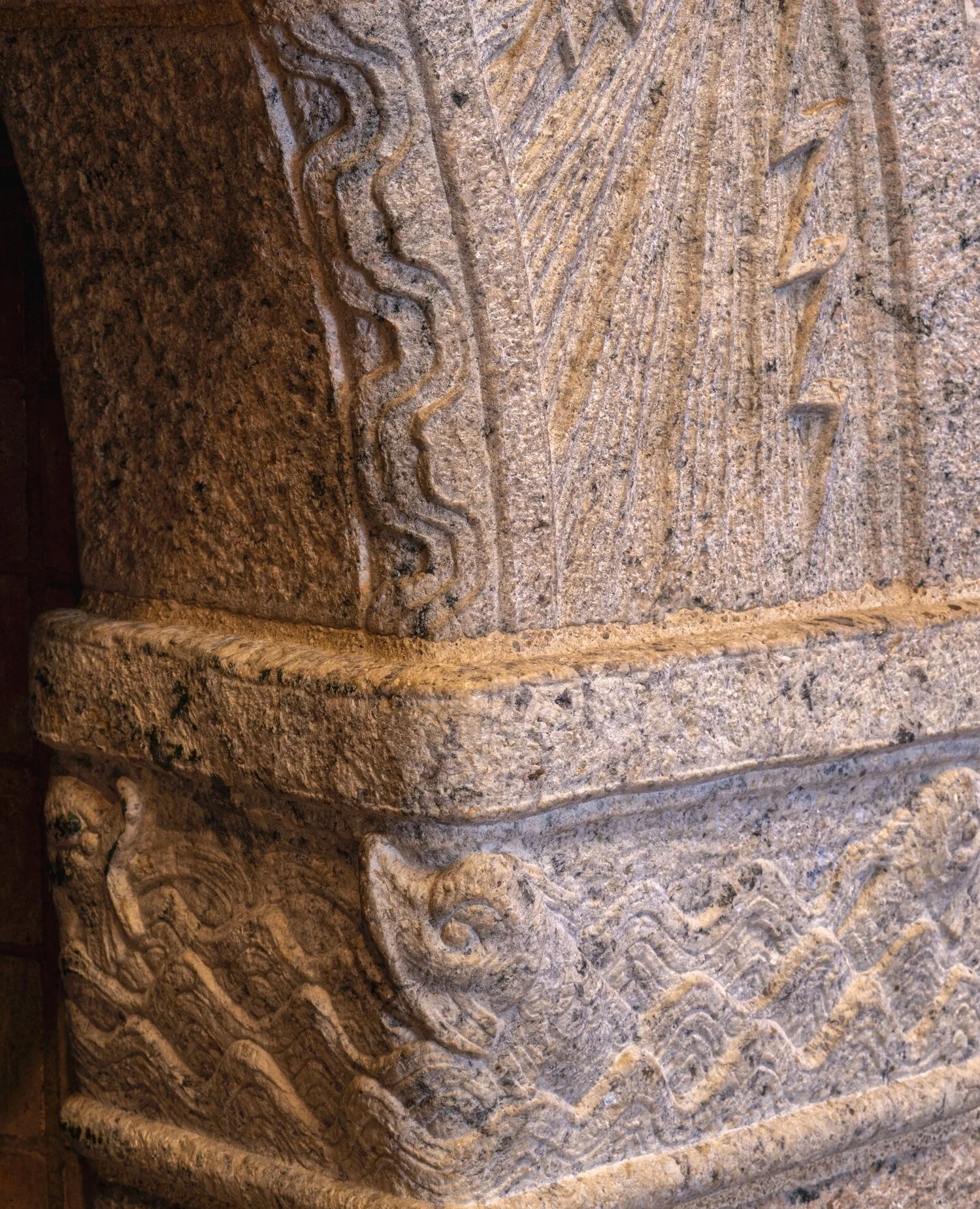 Figure 9: This granite relief sculpture, carved by Bryn Athyn craftsmen, decorates the monumental fireplace in Glencairn’s Upper Hall. It depicts the days of creation as described in the first chapters of the Book of Genesis. The clouds of heaven have been carved in a continuous band along the inside of the arch, above both the land and the sea. These images seem to illustrate the very first verse in the Bible: “In the beginning God created the heavens and the earth” (Genesis 1:1). Read more about this sculpture here.