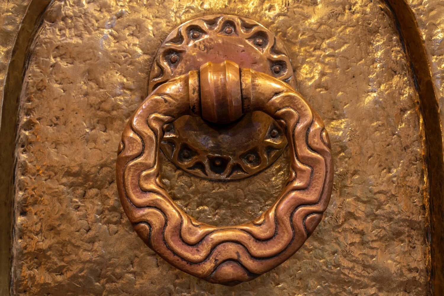 Figure 13: The clouds of heaven seem to be the inspiration for the decoration on this circular handle made for the copper doors in Glencairn’s Great Hall.