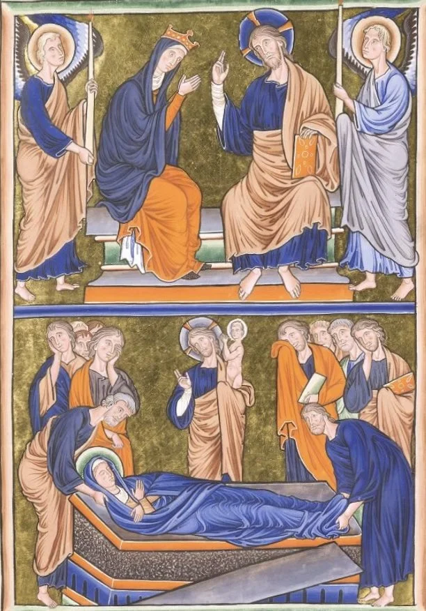 Figure 2: Dormition and Coronation of the Virgin, Ingeborg Psalter, Chantilly, Musée Condé, ms. 009, 34r. Creative Commons.