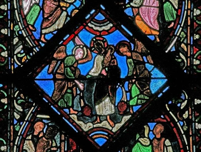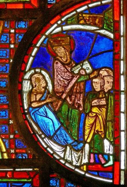 Figure 6: Panel of the Virgin raising a child, from the Changers of Alonnes window (Childhood and Miracles of the Virgin), Cathedral of Saint-Julien, Le Mans.