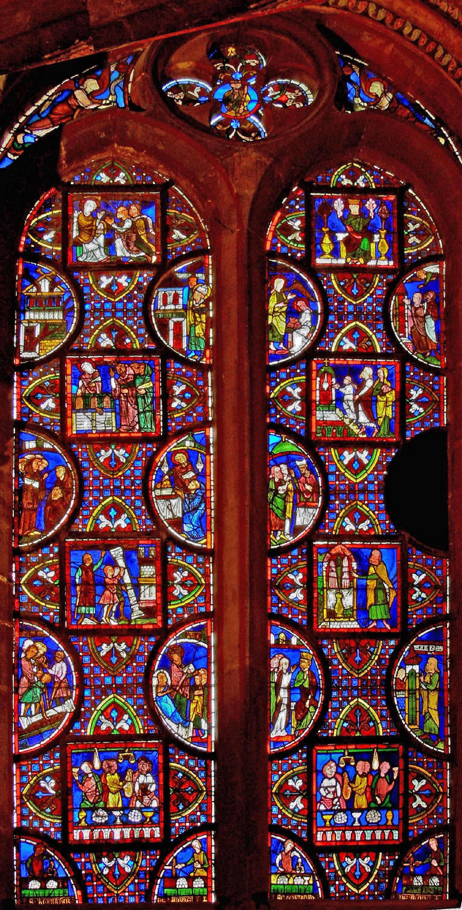 Figure 5: The Changers of Alonnes window (Childhood and Miracles of the Virgin), Window 5, Lady Chapel, Cathedral of Saint-Julien, Le Mans.