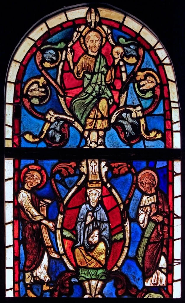 Figure 3: Christ with the Soul of His Mother, panel from the Glorification of the Virgin window, Cathedral of Notre-Dame, Chartres.