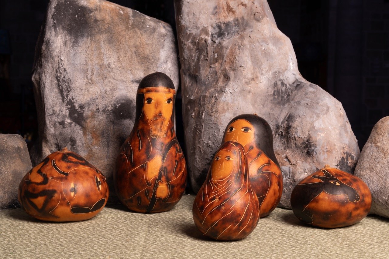 Figure 21: Gourd carving has been practiced in Peru for more than 4,000 years. Artisans harvest and sun-dry the gourds, which are then used for a variety of crafts, including Nativities. The gourds may be painted, carved, or decorated using a burning technique called quemado, which creates a range of brown tones. Designs on the gourds often convey personal or communal stories, myths, or scenes from everyday life. On loan from A.J. DiAntonio, Malvern, PA.