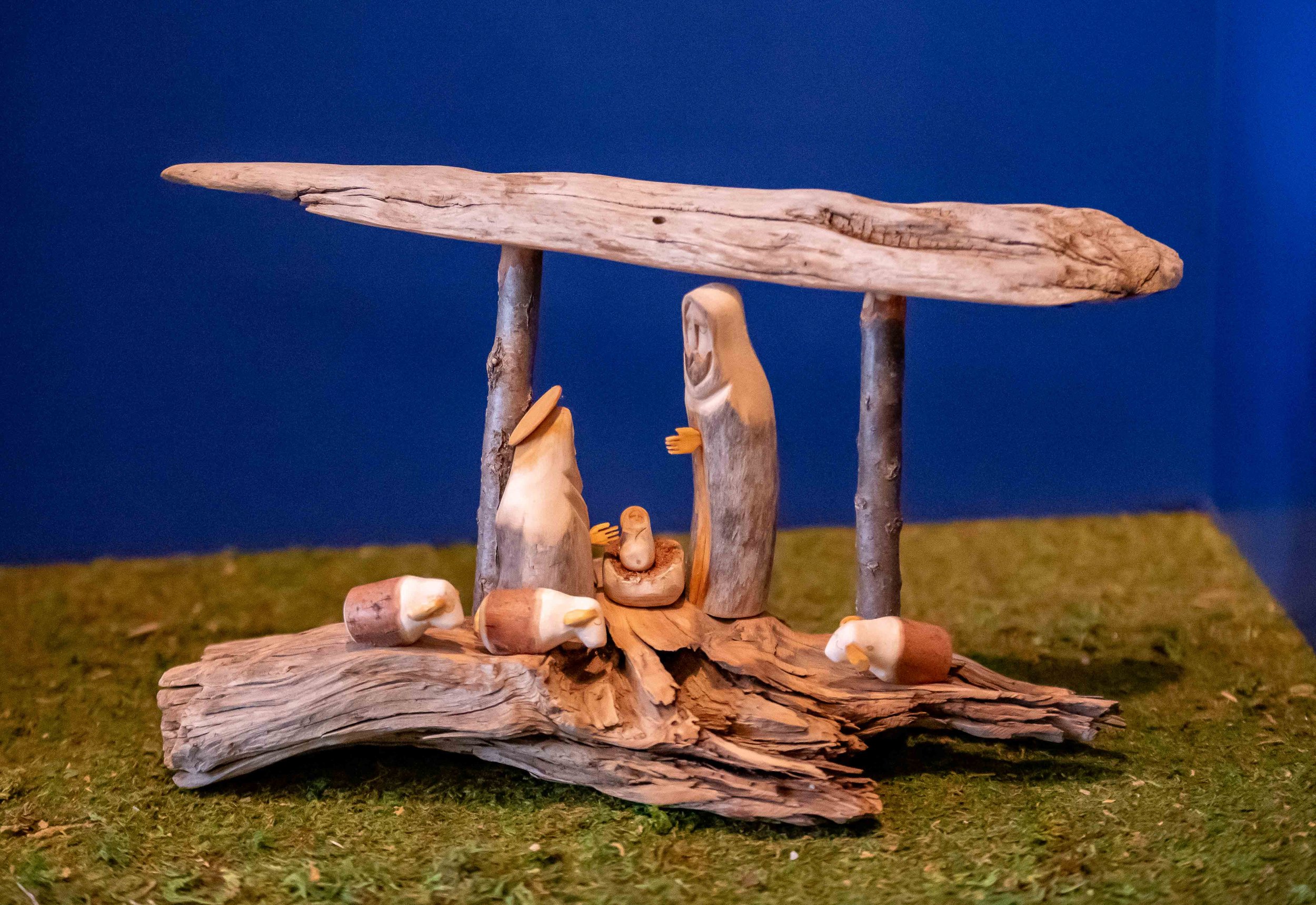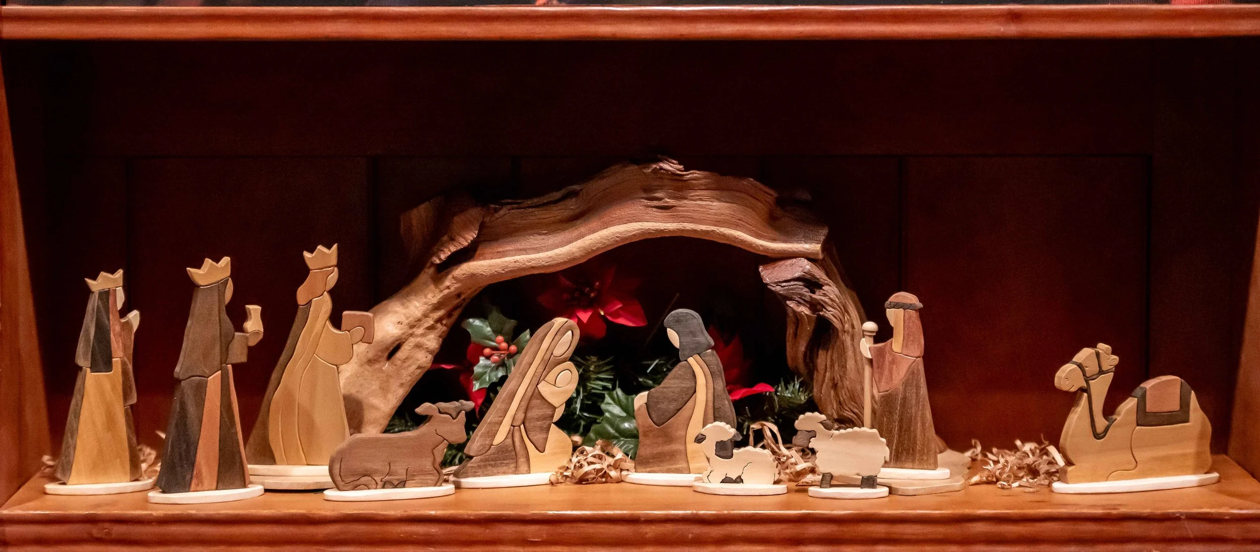 Figure 8: Scroll saw Nativity with manzanita wood stable (2013, age 33). Figures individually cut by A.J. DiAntonio from poplar wood, stained, and reassembled with a stable made of manzanita wood from Southern California. On loan from A.J. DiAntonio.