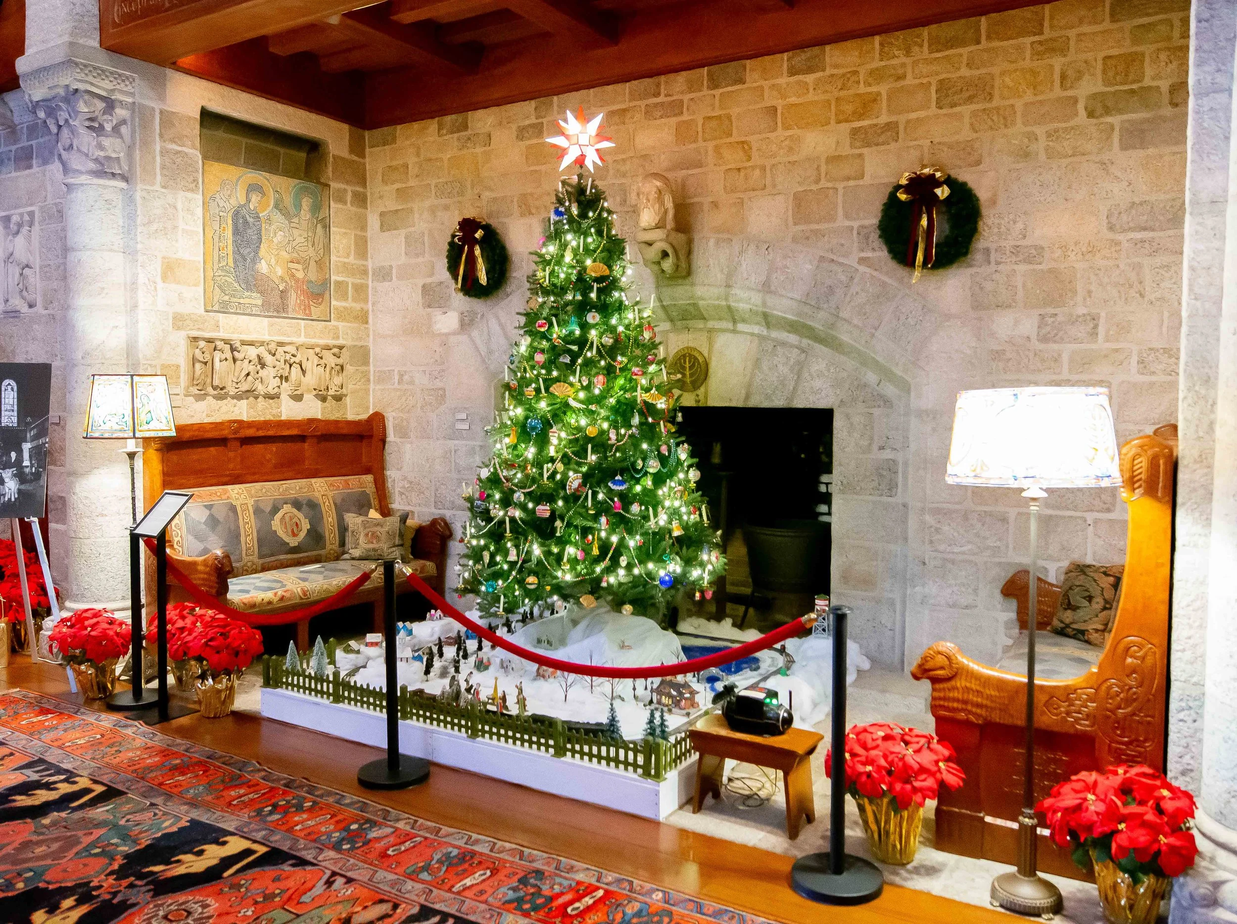 Figure 4: Glencairn’s tree with vintage ornaments and Christmas village, most of which were donated in 2011 by Brother Bob Reinke of Hoboken, New Jersey. The Nativity beneath the tree this year was handmade in the 1930s by a family in eastern Germany.