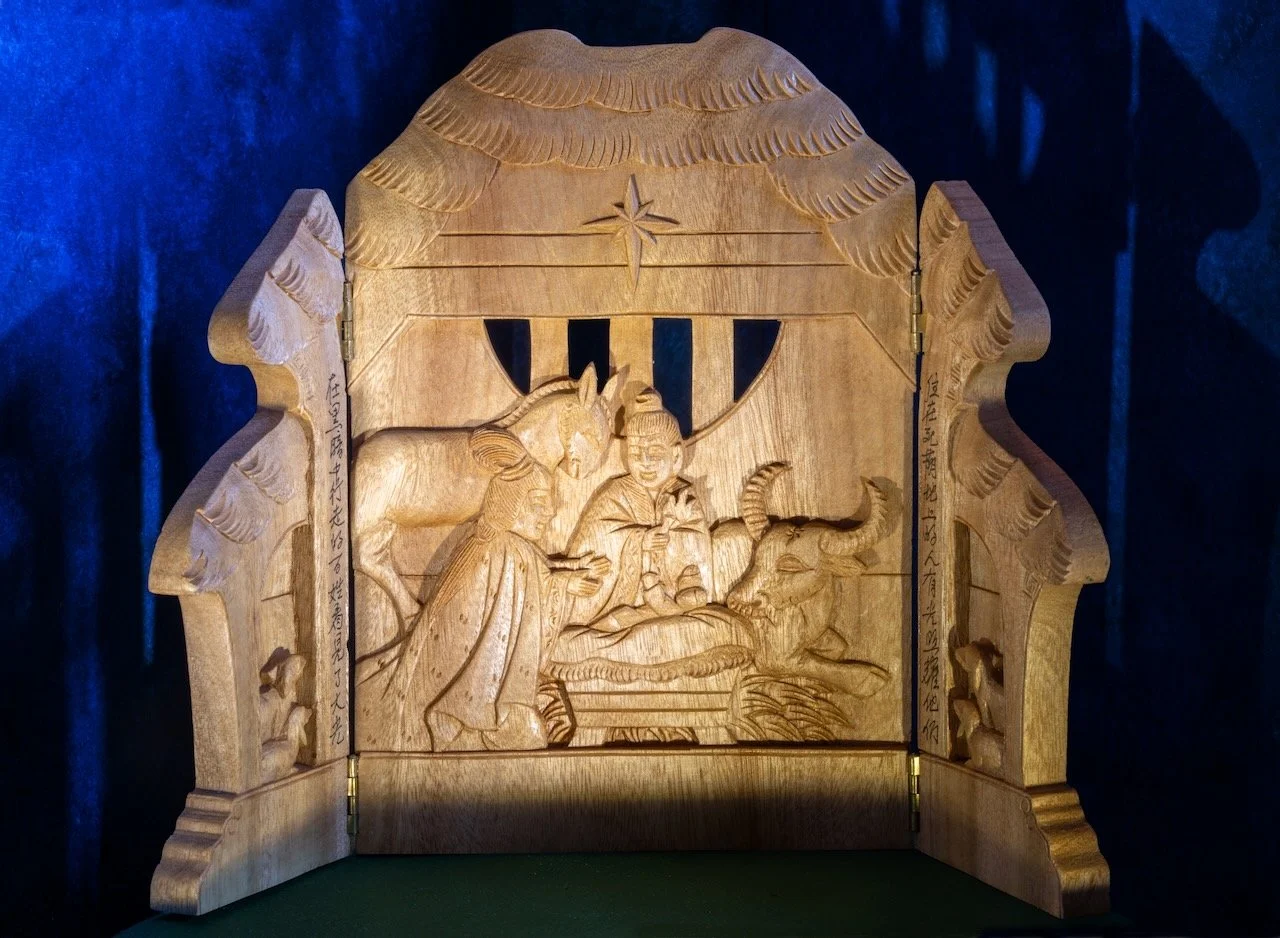 Figure 19: This Nativity was designed by Zhang Wanlong, a Chinese Christian, and carved in his woodworking shop in China. His shop, the Amity Christian Arts Center, is in the province of Zhejiang, a region famous within China for its ancient tradition of woodcarving. All of Wanlong’s products are inspired by Christian themes and biblical stories, and he is proud of his “union of Eastern and Western traditions.” The center of the triptych features the Holy Family with an ox (a Chinese symbol of protection and patient strength) and a donkey.