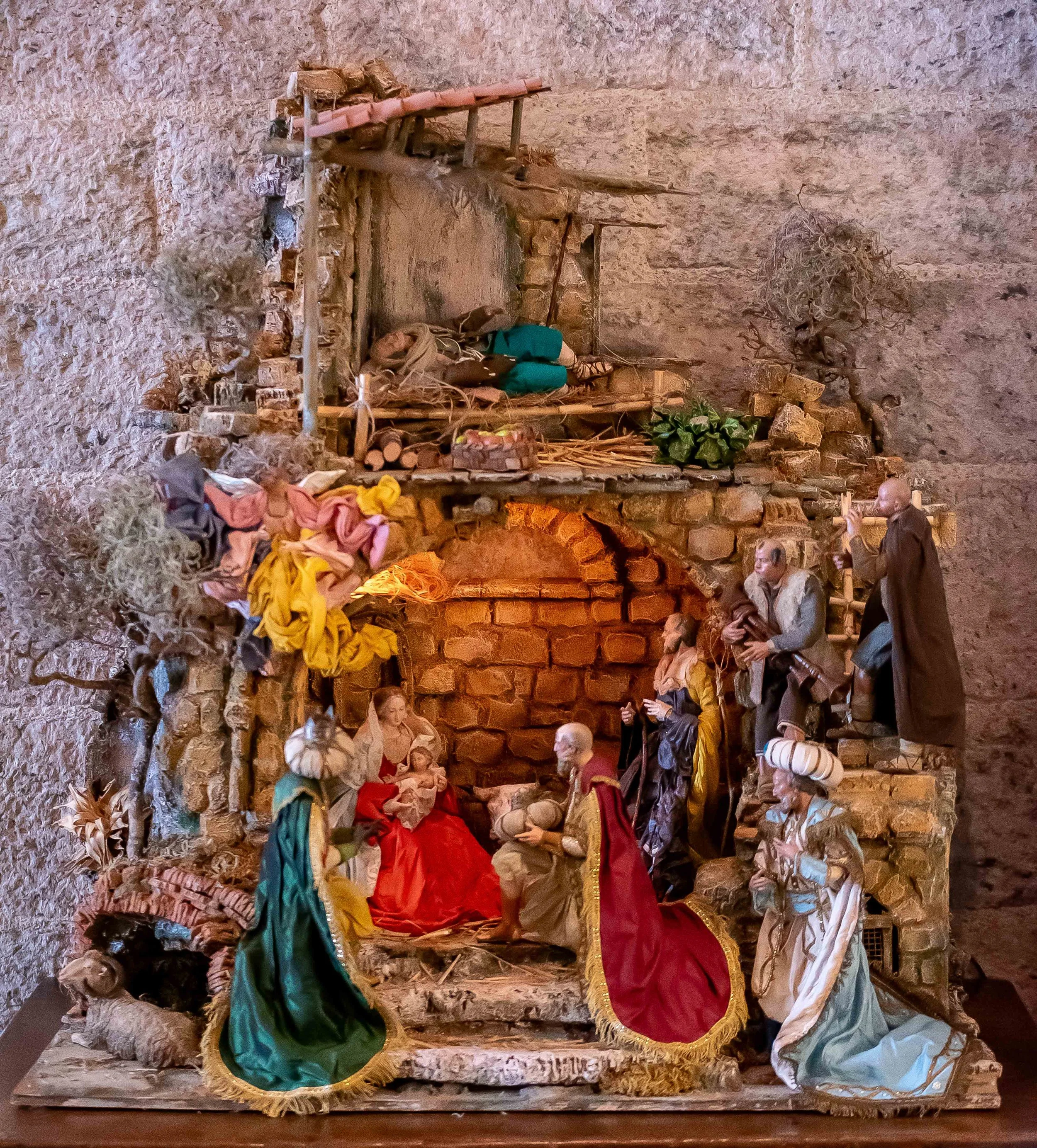 Figure 18: This Neapolitan presepio (Nativity) is the work of the Giuseppe and Marco Ferrigno company, a fourth-generation family business located in Naples, Italy. The Ferrignos own several shops on Via San Gregorio Armeno, a street known around the world by collectors of Nativities. The faces, hands, lower legs, and feet of the figures are made of terracotta, and the limbs were formed with wire wrapped in cloth so that each figure is posable. The clothing was handmade and draped in San Leucio silks. Most of the figures have glass eyes.