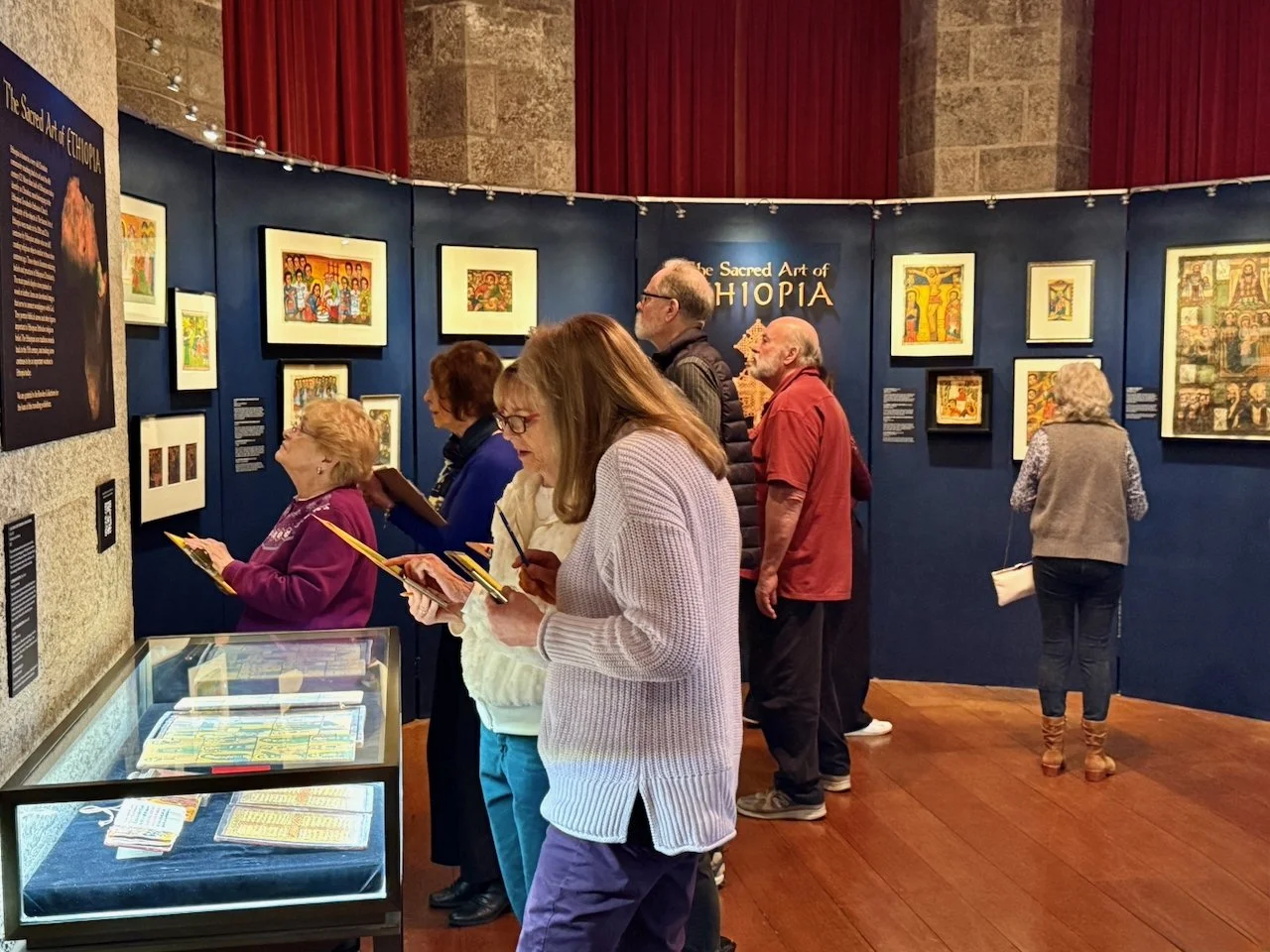 With guided worksheets in hand, guests at the opening of The Sacred Art of Ethiopia exhibition on March 7, 2026 compare Ethiopian sacred art with works from other cultures in the Glencairn Museum collection.