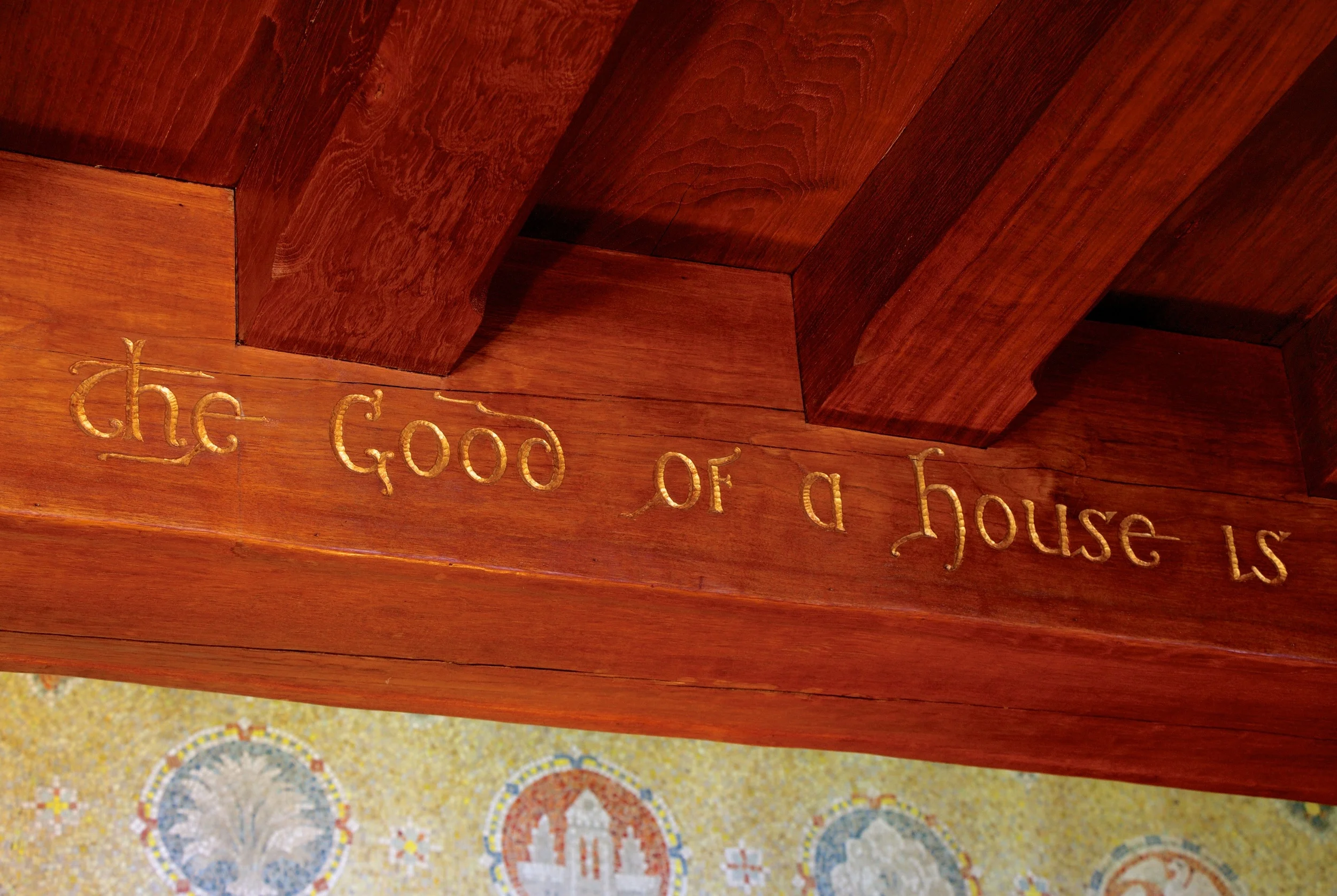 Mottoes, phrases, and quotations in Latin and English can be found throughout both Fonthill and Glencairn. At Fonthill these inscriptions are usually spelled out using ceramic alphabet tiles produced in the Tile Works, whereas at Glencairn they are incorporated into stained glass windows or glass mosaics, engraved on teakwood beams, or carved in stone. Inscriptions in Fonthill are often cryptic, but reveal Mercer’s interest in history and philosophy. There are also touches of humor, such as the tribute he paid to his beloved dog, Rollo (Figure 1). When the stairs were being built leading up from the Columbus Room (one of 32 stairways in Fonthill), the dog’s paws were pressed into the cement, and the words “Rollo’s Stairs” were added to the stair risers (Figure 6). Paw prints can also be seen at the Mercer Museum, and after Rollo’s death in 1916 Mercer wrote, “May his footsteps outlast many generations of men on his stairways at Fonthill and the Bucks County Historical Society” (“Tribute to Rollo: From a Notebook of Henry Chapman Mercer,” Penny Lots Vol. 26, No. 2, 2012, 16). Pitcairn’s inscriptions at Glencairn are generally taken from the Bible or the theological works of Emanuel Swedenborg (1688-1772). Engraved in gold lettering on two teakwood beams in the entrance hall of Glencairn is this inscription (Figure 7): “That a house may be built, materials must first be provided, the foundation laid, and the walls erected; and so finally it is inhabited. The good of a house is the dwelling in it” (Emanuel Swedenborg, The Doctrine of Charity, 1766, ¶129).