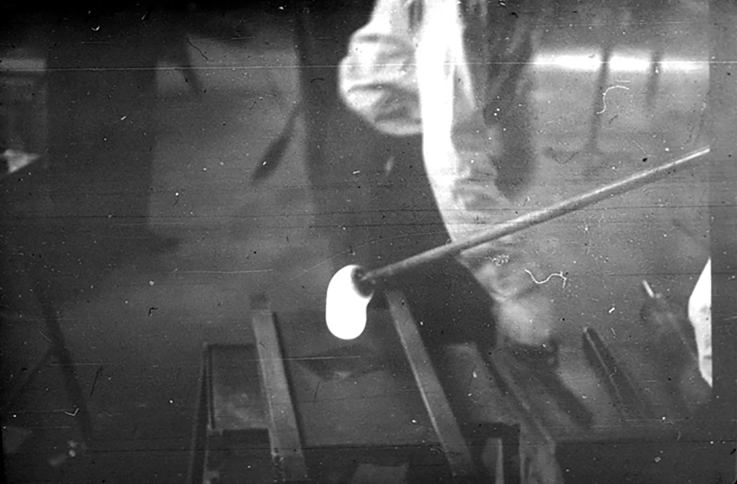 Figure 2: Ariel Gunther rolling out mosaic glass on a marver.