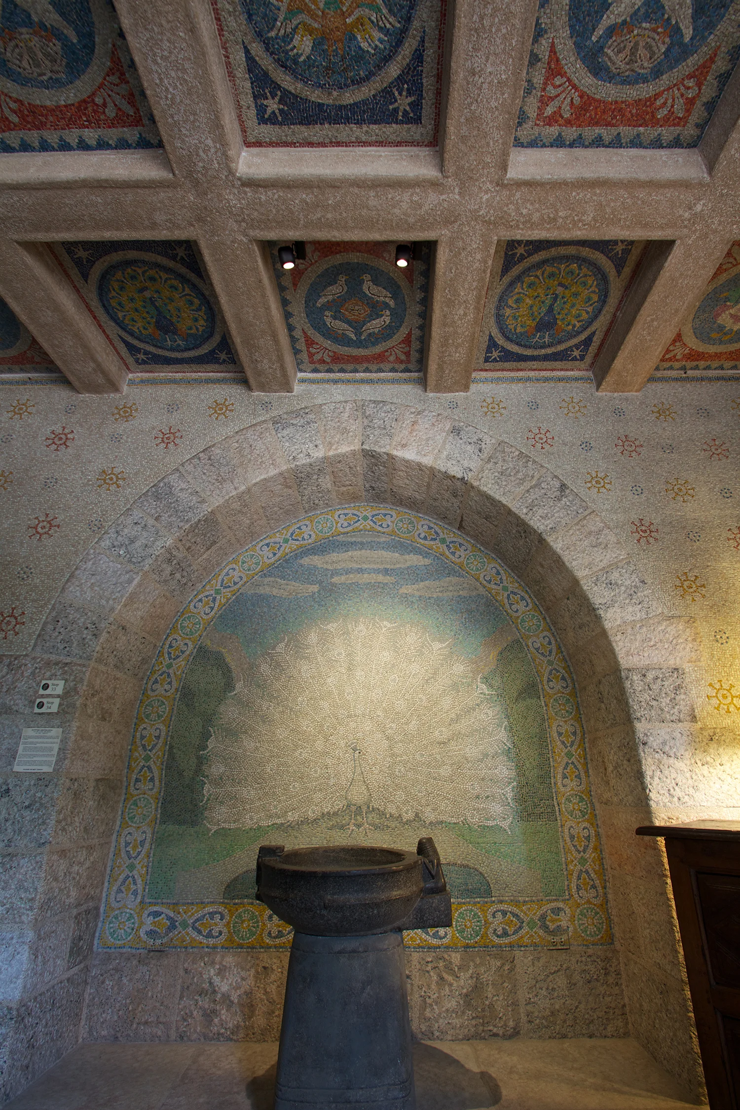 In Glencairn both the first floor and the fifth-floor chapel contain large-scale mosaics. The walls of the first-floor entryway are covered in mosaic designs (Figure 1) with symbols representing church, country, family and education—a theme that continues up the stairway to the second floor. Beyond the entryway, the Bird Room features mosaic birds on the partitioned ceiling and a large mosaic of a white peacock on the wall (Figure 5). The peacock mosaic is set into a recessed arch, providing an unusual backdrop for an ancient Egyptian libation bowl.